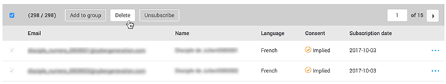 - To delete all the members who appeared as the result of a search, check the box on the left-hand side of the word “email” above the list of contacts. This will select all of the email addresses from the results pages.