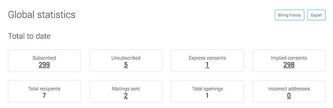 To view your account's global statistics such as the number of subscribers, unsubscribed contacts, express or implied consents, incorrect addresses, letters sent, and total openings, click the in the menu on the left of the screen.
