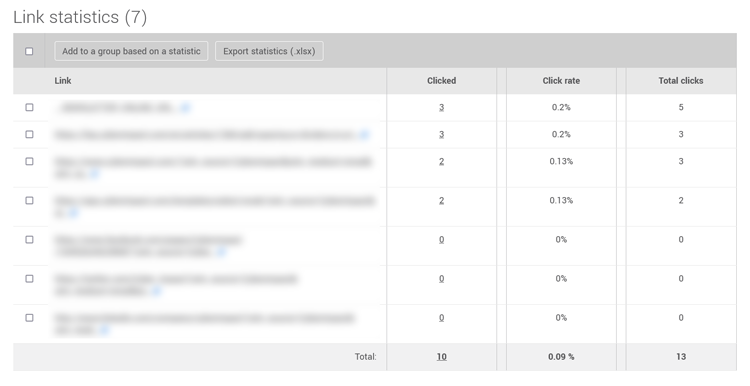 A list of all links in your mailing is displayed under the Links statistics section at the bottom of the detailed statistics page of your mailing. By clicking on the numbers, you can see exactly which contact has clicked on each link.