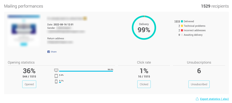 - Number of deliveries: Number of emails successfully delivered, corresponding to the recipients minus technical issues and invalid addresses.