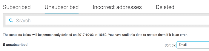 - Click the "Unsubscribe" button and select "Yes" to confirm the action. Your contacts will be unsubscribed and will be moved to the "Unsubscribed" tab of the "Contacts" section of your account.