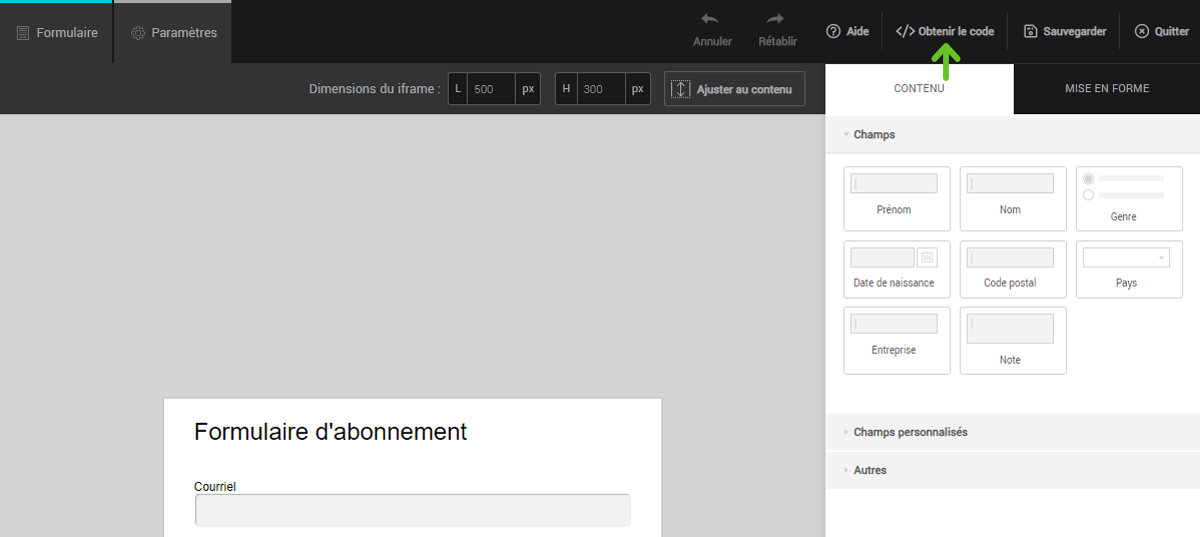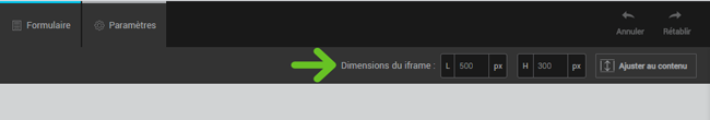 Un iframe est une zone avec des mesures définies. Si, par exemple, vous voulez insérer votre formulaire dans le pied de page de votre site et que la zone disponible mesure 450 pixels de large par 250 pixels de haut, ce sont les mesures que vous devez utiliser. Vous pouvez régler ces dimensions dans l’éditeur de formulaire. De cette façon, vous travaillerez dans un aperçu qui reflète les bonnes dimensions et nous vous fournirons le code avec les mesures appropriées.