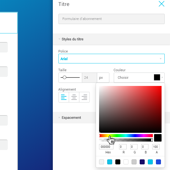 Le sélecteur de couleur est disponible dans plusieurs panneaux. Cliquez sur l’échantillon de couleur pour ouvrir la fenêtre contextuelle. Vous pouvez choisir une couleur dans la zone de sélection ou entrer un code de couleur pour plus d’exactitude.