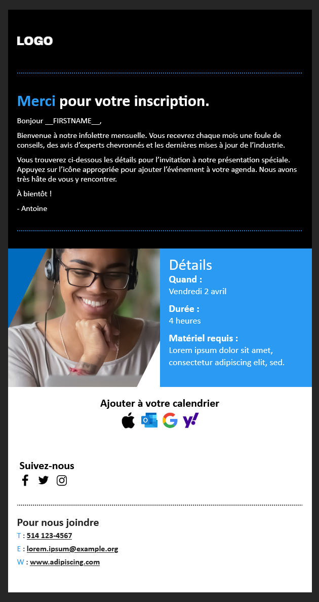 • des informations quant au contenu de vos futures infolettres (ex.: à quoi doivent-ils s’attendre, à quelle fréquence vont-ils recevoir des courriels, un “teaser” sur vos prochains envois)
