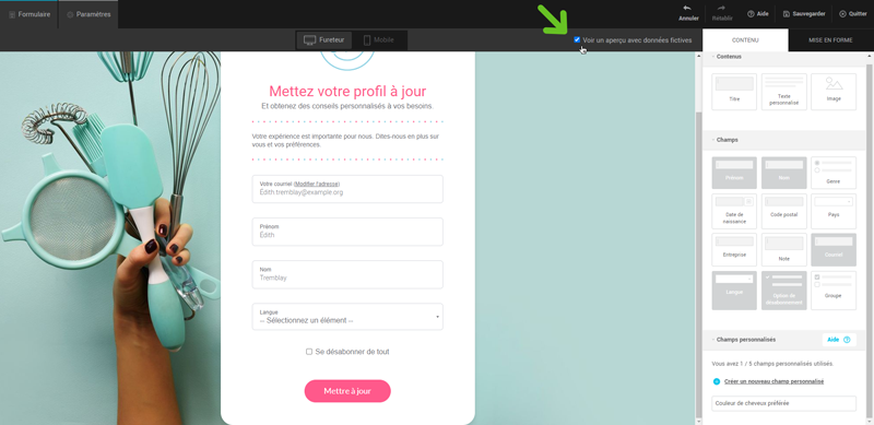 Pour voir comment s’afficheront les données de vos contacts dans les champs de votre formulaire, activez l’option Voir un aperçu avec données fictives.