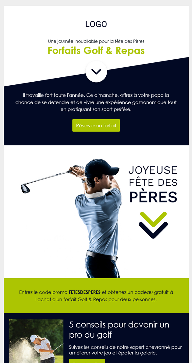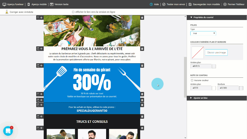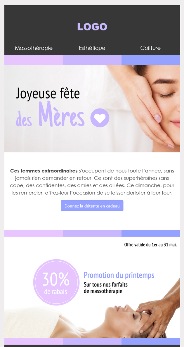 Lorsque vous concevez votre infolettre, assurez-vous qu'il y ait suffisamment d'espacement autour de votre appel à l'action (CTA) et entre vos nouvelles afin de conserver une bonne lisibilité et de maximiser la compréhension ainsi que la clarté de votre message. Cela permettra d'aérer votre design et de ne pas submerger votre lecteur d'informations. Lorsqu'il y a trop d'éléments, de texte ou d'images au même endroit, cela peut rendre la lecture ardue et le cerveau ne sait plus où regarder. L'espacement, aussi appelé "espace blanc" ou "espace négatif", aidera votre abonné à bien voir, parcourir et comprendre rapidement les différentes sections de votre courriel. Pour créer des délimitations entre vos différents sujets, vous pouvez également utiliser des séparateurs, mais pensez à mettre suffisamment d'espace avant et après ceux-ci. C'est la même chose pour votre CTA, en ajoutant de l'espace autour de celui-ci il sera plus facile à repérer.
