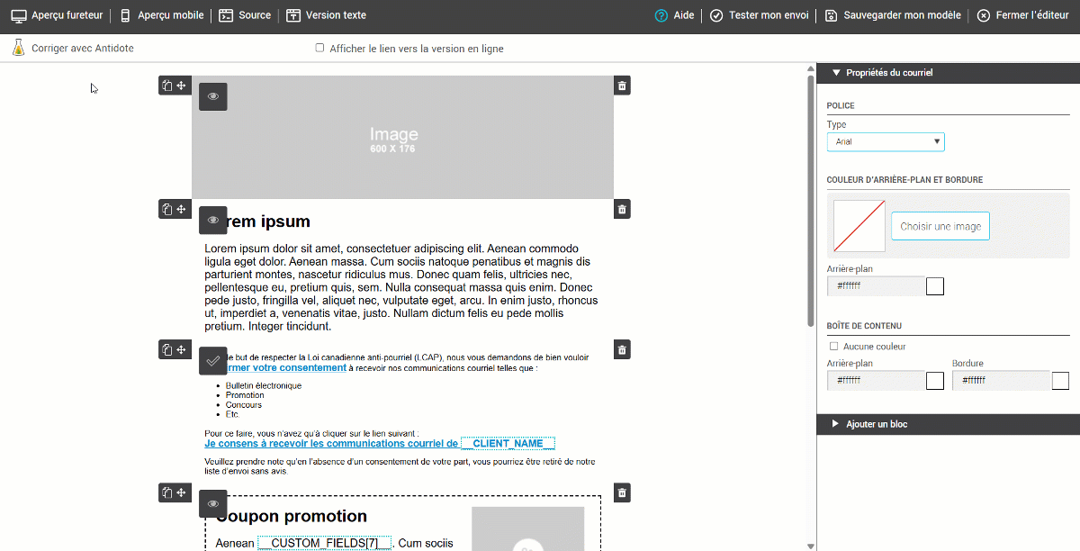 Avant de procéder à votre envoi, il est important de vérifier que les blocs dynamiques s'affichent correctement. Pour cela, utilisez les boutons Aperçu fureteur ou mobile. Ces options vous permettent de visualiser votre modèle tel qu'il apparaîtra pour vos destinataires, y compris les blocs dynamiques. Il vous suffit d'activer ou de désactiver les interrupteurs pour afficher ou masquer les blocs dans l'aperçu.