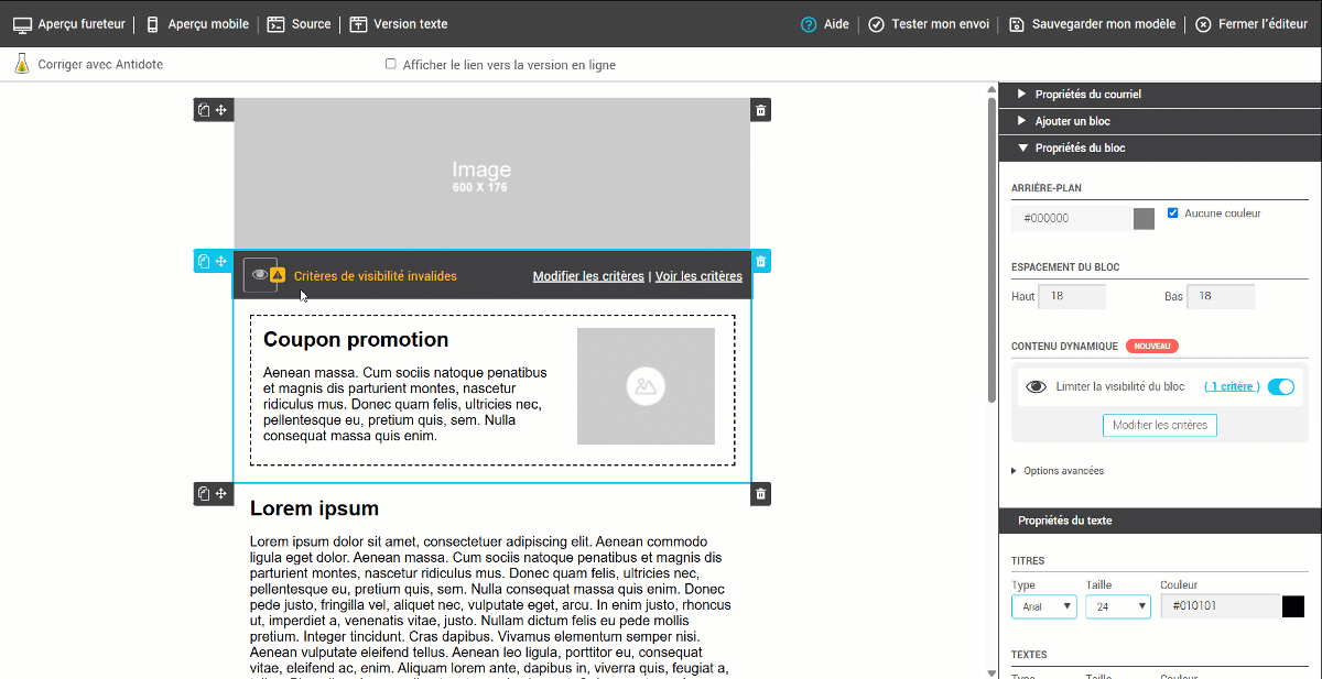 Une fois que vous avez créé et prévisualisé votre bloc dynamique, sauvegardez votre modèle. Vous pouvez ensuite effectuer un test d'envoi pour vous assurer que le bloc dynamique s'affiche correctement pour les destinataires concernés.