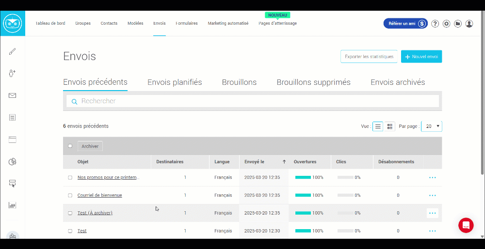 Lorsque vous envoyez régulièrement des campagnes, votre section Envois précédents peut rapidement s'encombrer de tests ou d'envois devenus obsolètes. Pour garder une vue claire et organisée, vous avez la possibilité d'archiver des envois sans les supprimer.