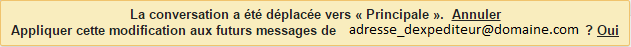 Vous pouvez glisser un courriel d'une boîte de réception à l'autre. Ce faisant, Gmail affichera un message dans le bandeau orange vous confirmant le transfert à la boîte désirée. De plus, Gmail en profite pour vous demander si vous désirez appliquer cette modification aux futurs messages de la même adresse d'expéditeur. Il suffit alors simplement de cliquer sur le mot oui. Les messages provenant du même expéditeur seront alors automatiquement dirigés vers la boîte de votre choix.