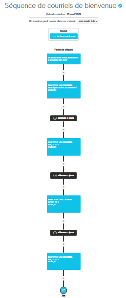 Un scénario est un parcours automatisé qui débute par un événement déclencheur (par exemple, l'inscription à un formulaire, l'ouverture d'un envoi, l'ajout d'un contact à un groupe, l'expiration du consentement tacite de vos contacts...). Les contacts, qui passeront par cet événement déclencheur, progresseront dans votre parcours, étape par étape, à l’aide d’actions et de conditions que vous aurez déterminées au préalable. Par exemple, suite à l'inscription à un formulaire, vous pourriez automatiser une série d'envois de courriels.