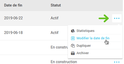 - Cliquez sur le menu d'actions à la droite du sondage et sélectionnez Modifier la date de fin.
