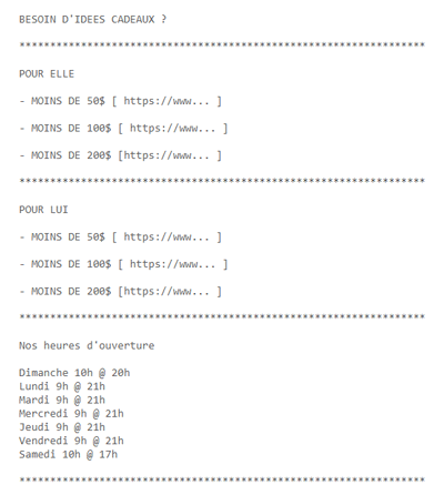 • Formattez votre texte pour qu’il soit plus lisible : créez des listes à puces avec des astérisques (*) ou des barres horizontales avec des signes d’égalité (=), espacez les différentes sections en ajoutant des retours de chariot.