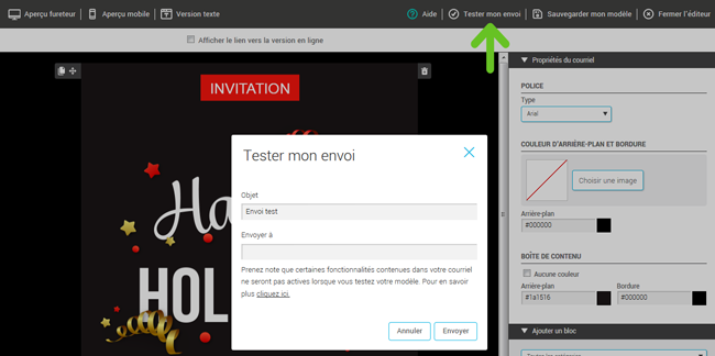 Pour ce faire, vous disposez de l'outil "Tester mon envoi" dans le haut de la page de personnalisation des modèles et brouillons.