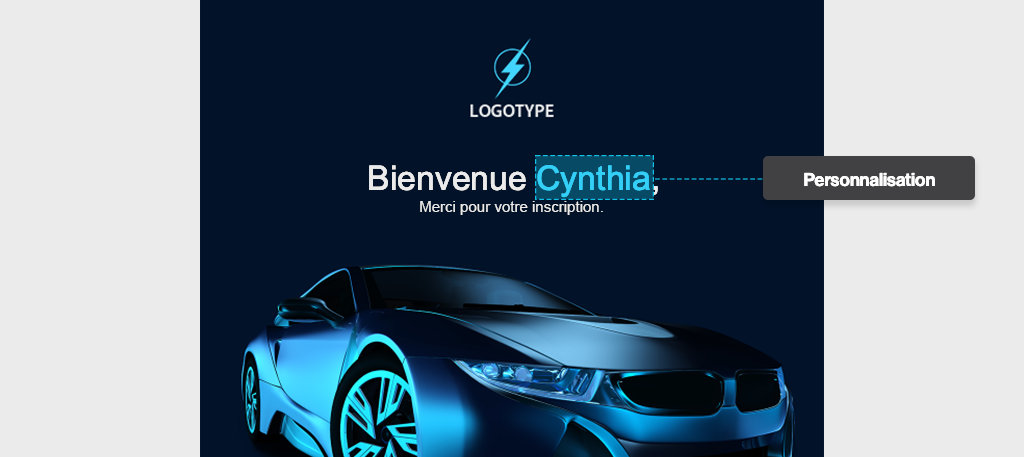 L’exemple le plus commun de l'emploi de contenu dynamique est l'insertion du nom de vos abonnés dans vos messages, mais vous constaterez qu'il existe un nombre infini d'autres possibilités de personnalisation. Les informations sauvegardées dans les champs réguliers et personnalisés de vos abonnés peuvent être ajoutées dans le corps de vos messages ainsi que dans leur objet et leur texte d'aperçu. On peut aussi s'en servir pour générer des images différentes et des liens uniques.