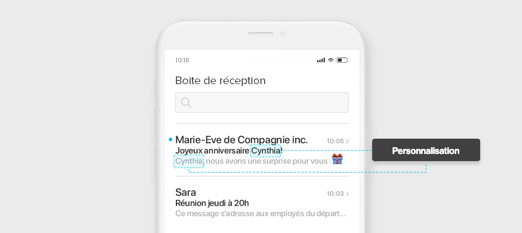 Personnaliser ses envois, ce n’est pas qu’ajouter le nom de vos contacts dans vos courriels, c’est aussi d'envoyer le bon courriel, à la bonne personne, au bon moment. C’est se baser sur leurs préférences et leurs intérêts pour leur partager du contenu qui leur sera pertinent et utile. Utiliser ce que vous connaissez d’eux (ex.: langue, genre, profession, âge, géographie...) pour leur envoyer des communications qui auront de la valeur pour eux. Le but est de bâtir une relation avec vos abonnés et vous réussirez s'ils sentent que vous êtes attentifs à leurs besoins et si vous leur démontrer qu’ils comptent pour vous. Et tout ça n’a rien de compliqué !