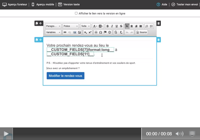 Par exemple, vous désirez saluer vos contacts par leur prénom. Dans votre texte, vous ajouterez donc la variable de ce champ (ex. : Bonjour __FIRSTNAME__, ...).