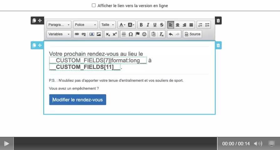 • S’il un mot au hasard est entouré de barres de soulignement (ex.: __PATATE__) et que celui-ci  n’est pas la variable connue d’un champ, l’expression sera visible telle quelle dans l’envoi. Cependant, les pointillés et le point d’exclamation (qu’on voit dans l’éditeur) seront retirés. Donc, si le système a détecté de fausses variables dans votre texte, le contenu va quand même s'afficher dans l’envoi.