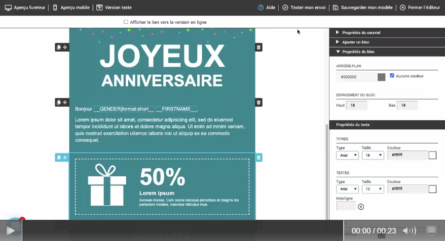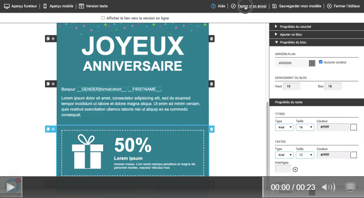 À partir de l’éditeur de modèles prédessinés et de base, cliquez sur l’outil Tester mon envoi situé en haut à droite. Dans l’éditeur HTML, vous le trouverez plutôt en bas à droite.